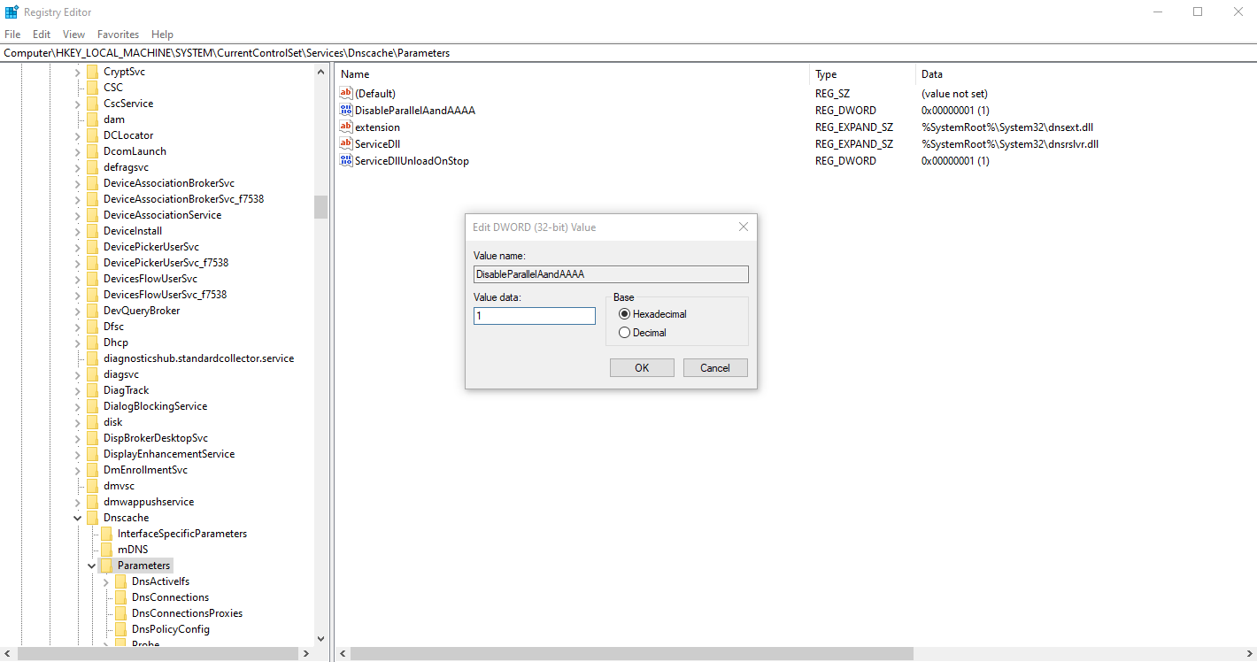 Computer\HKEY_LOCAL_MACHINE\SYSTEM\CurrentControlSet\Services\Dnscache\Parameters