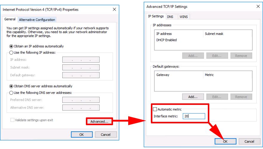 On that same Properties page, double click IPv6 > Advanced > Uncheck Automatic Metric > Enter 10 for interface metric > OK > OK